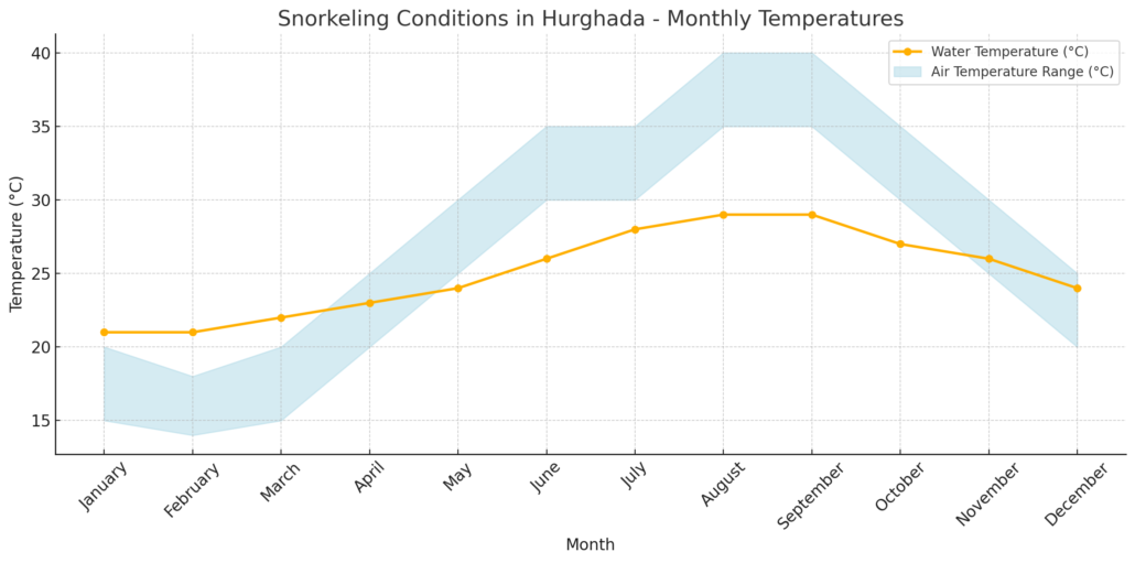 To make the best decision on when to travel to Hurghada to go diving, we made you a list. This list shows the air and water temperature in Hurghada per month: